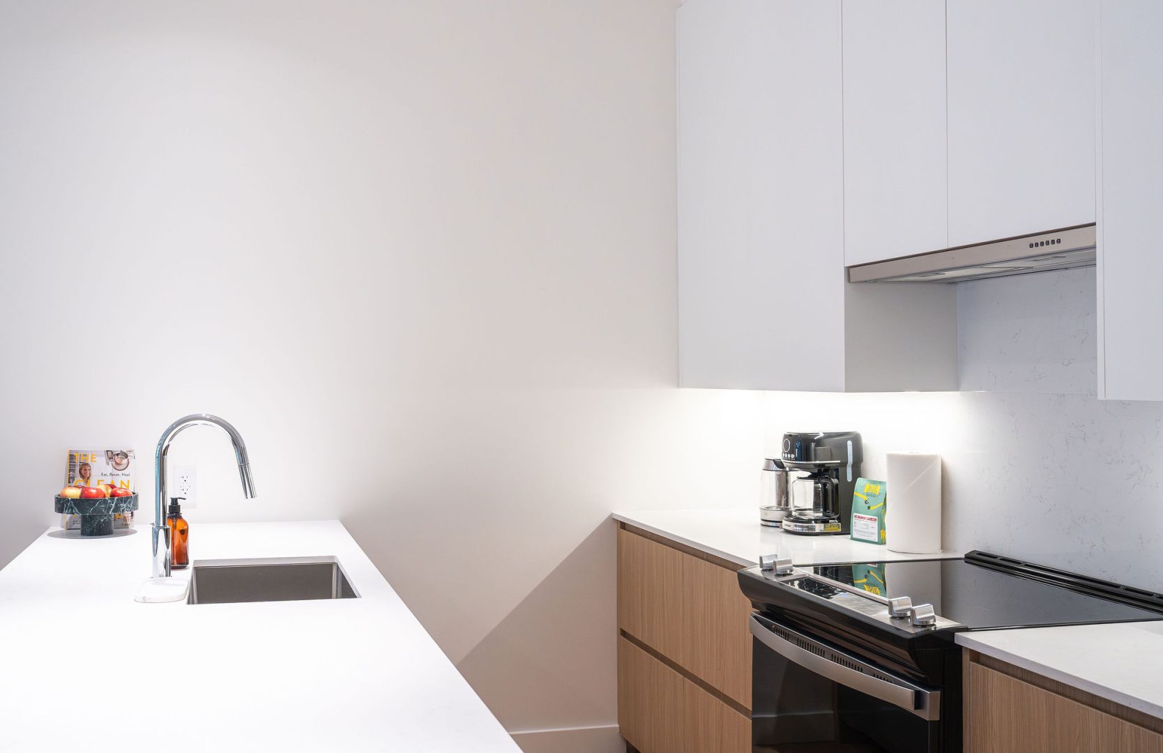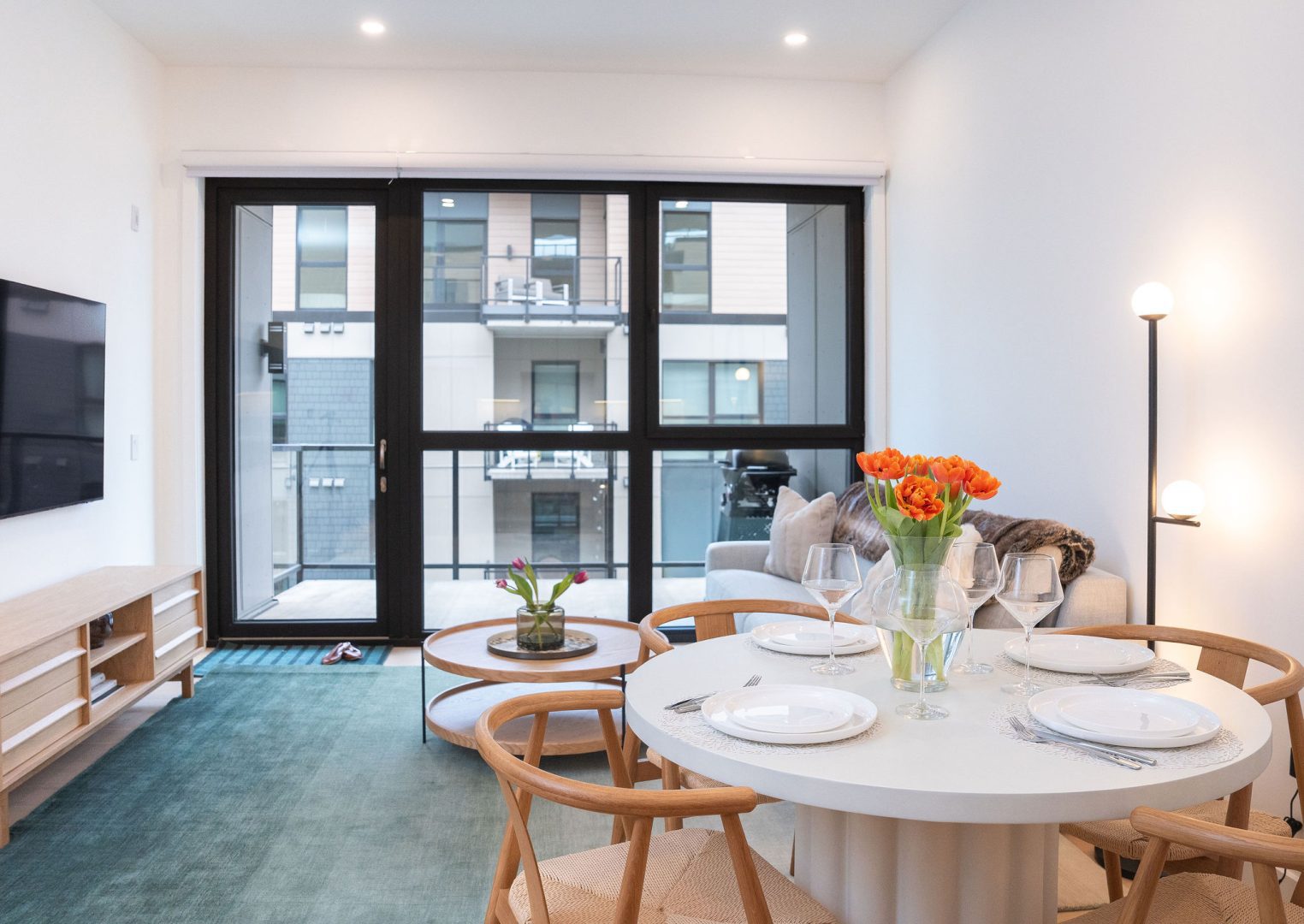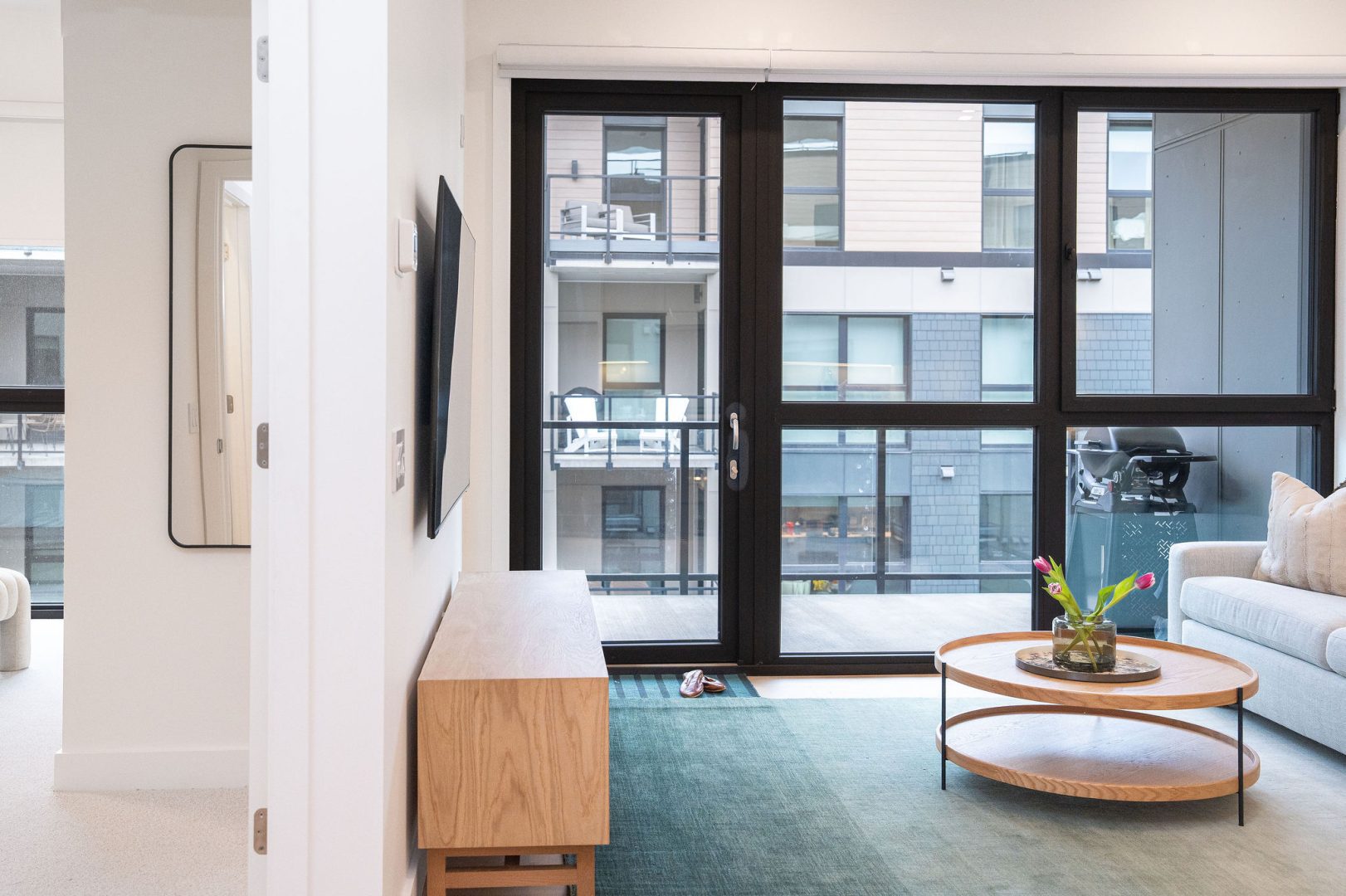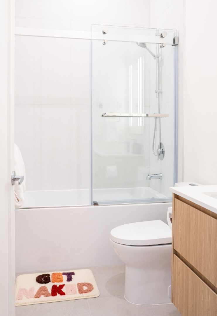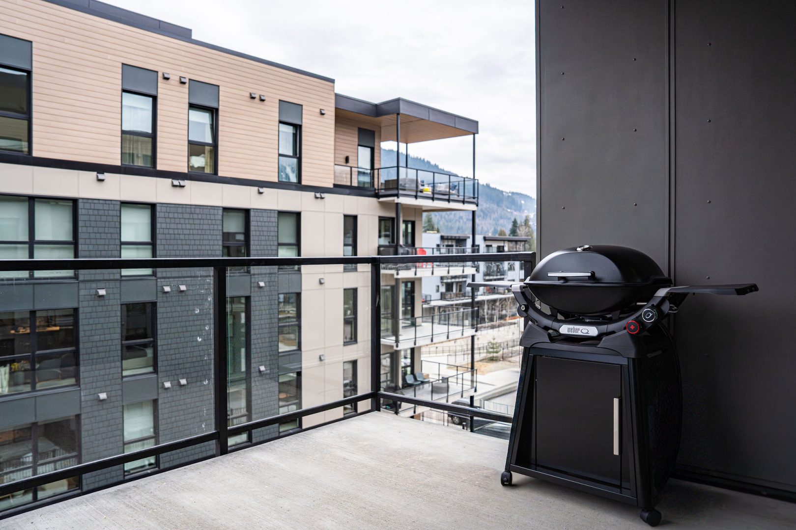 The living room features a comfortable EQ3 couch with queen sofa bed, while the bedroom includes a queen bed with a high-quality Endy mattress and Benji bedding for a comfortable night’s sleep. The fully stocked kitchen is equipped with everything you need to extensively cook meals during your stay, and the balcony is perfect for enjoying the mountain air and cooking on the Weber propane BBQ. Guests also have access to the rooftop terrace with two large hot tubs, outdoor fireplaces, a gas BBQ, and incredible mountain views — the perfect place to relax after skiing, biking, or hiking.